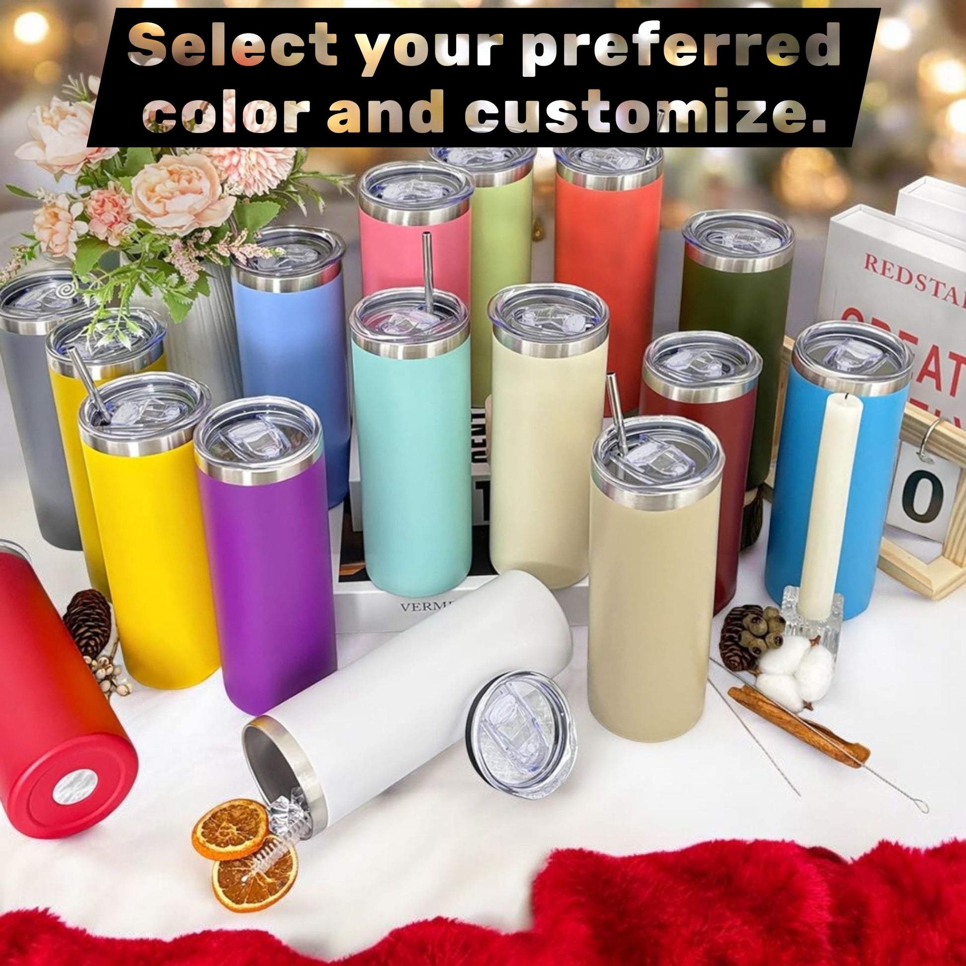 Check out our awesome Custom 20oz Stainless Steel Skinny Tumblers! They're super versatile and look great. You can totally make them your own with names, initials, pictures, or quotes. They're the perfect gift for anything, made from tough stainless steel, and come in tons of colors. Time to upgrade your drink game!